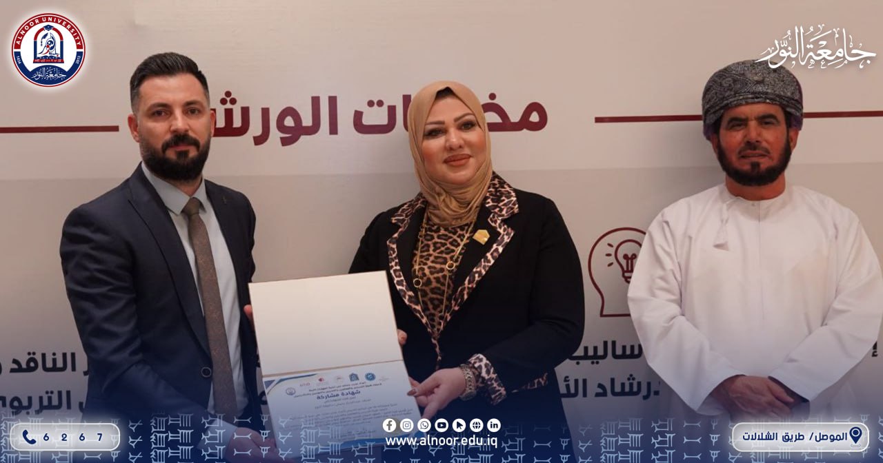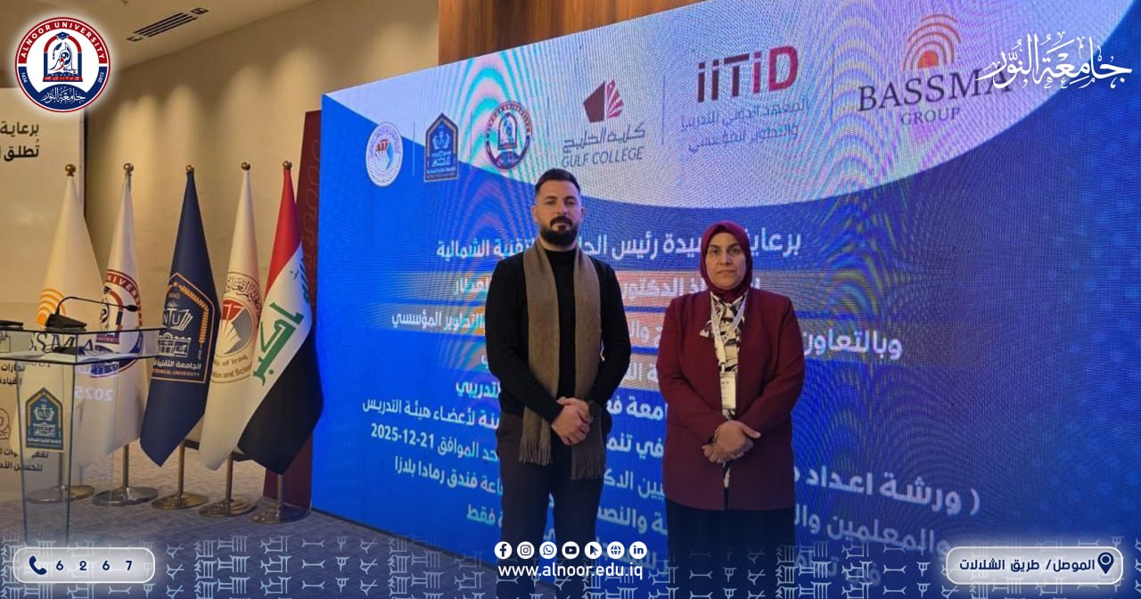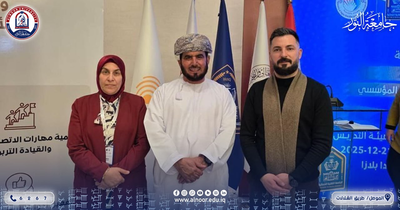 ضمن الجهود المستمرة لجامعة النور في دعم التطوير الأكاديمي وبناء القدرات البشرية، شارك عدد من تدريسيي الجامعة في برنامج «إعداد مدرب معتمد في تنمية المهارات اللينة» الذي أقامته الجامعة التقنية الشمالية للمدة من 21 إلى 24 كانون الأول 2025.بحضور الاستاذة الدكتورة علياء عباس العطار رئيسة الجامعة وشهد البرنامج مشاركة كل من المدرس الدكتور محمد عبدالجبار يحيى التدريسي في قسم التربية البدنية وعلوم الرياضة في كلية التربية والمدرسة الدكتورة اسماء يوسف ذنون التدريسية في كلية طب الأسنان، حيث قدّم البرنامج نخبة من الأكاديميين والخبراء، يتقدمهم البروفيسور علي بن حمد البادي عميد كلية الخليج في مسقط بسلطنة عُمان، والدكتور تقي بن عبد الرضا العبدواني الرئيس التنفيذي للمعهد الدولي للتدريب والتطوير المؤسسي، إلى جانب الدكتور محمد العزاوي. وتضمّن البرنامج جدولًا تدريبيًا متكاملًا جمع بين المحاضرات التفاعلية والتطبيقات العملية، بما أسهم في تعزيز مهارات المشاركين في مجالات التدريب وتنمية المهارات اللينة، وتمكينهم من نقل الخبرات المكتسبة إلى مؤسساتهم التعليمية. وتأتي هذه المشاركة في إطار حرص جامعة النور على تطوير كفاءة ملاكاتها التدريسية، ومواكبة متطلبات التعليم الحديث، بما يسهم في الارتقاء بالعملية التعليمية ودعم مسيرة التطوير المؤسسي المستدام.