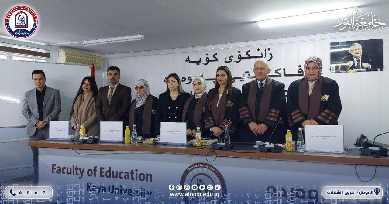 ترأس الأستاذ الدكتور محمد باسل قاسم العزاوي، التدريسي في قسم اللغة الإنكليزية بكلية التربية في جامعة النور، يوم الاثنين الموافق 2025/12/22 لجنة مناقشة رسالة الماجستير للطالبة سارا إسماعيل خضر، المقدّمة إلى قسم اللغة الإنكليزية في جامعة كويا. وجاءت الرسالة بعنوان: “The Role of Educational Applications in Promoting Students’ Engagement in EFL Classes: In-Service Teachers’ Attitudes” (دور التطبيقات التعليمية في تعزيز تفاعل الطلبة في صفوف اللغة الإنكليزية كلغة أجنبية: اتجاهات المدرسين أثناء الخدمة). وتأتي هذه المشاركة في إطار تعزيز التعاون العلمي والأكاديمي بين الجامعات العراقية، وإسهام تدريسيي جامعة النور في لجان المناقشات العلمية، بما يعكس مكانة الجامعة ودورها الفاعل في دعم البحث العلمي والارتقاء بالمستوى الأكاديمي.