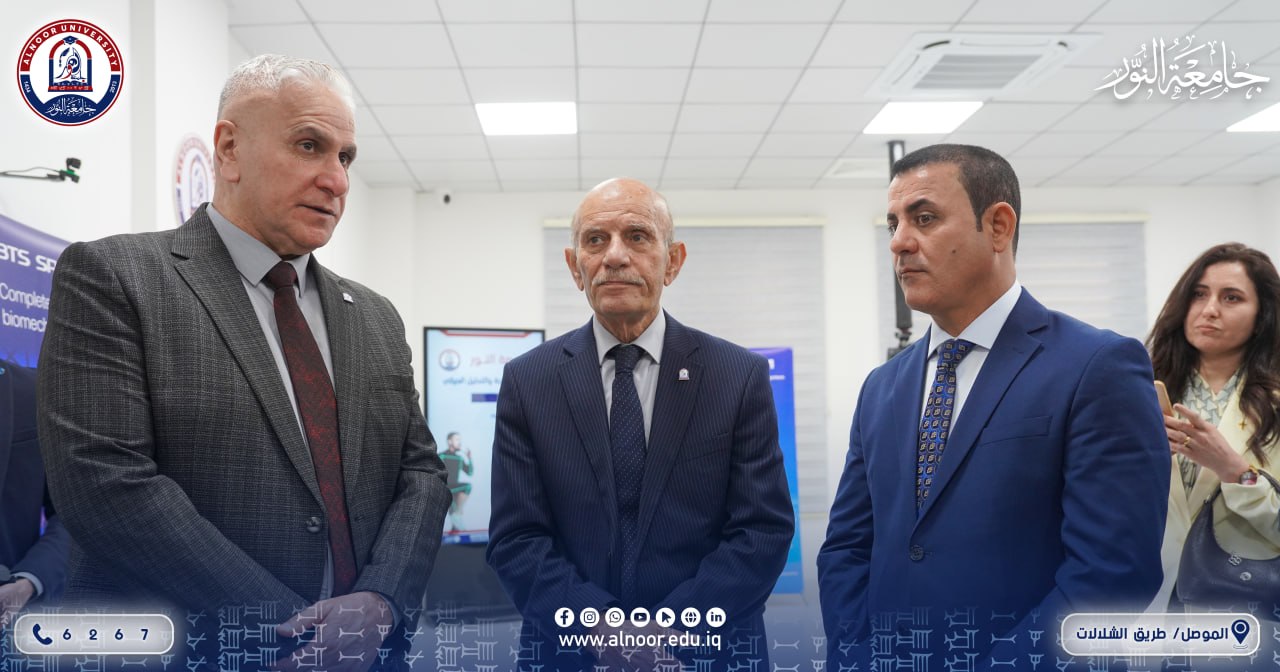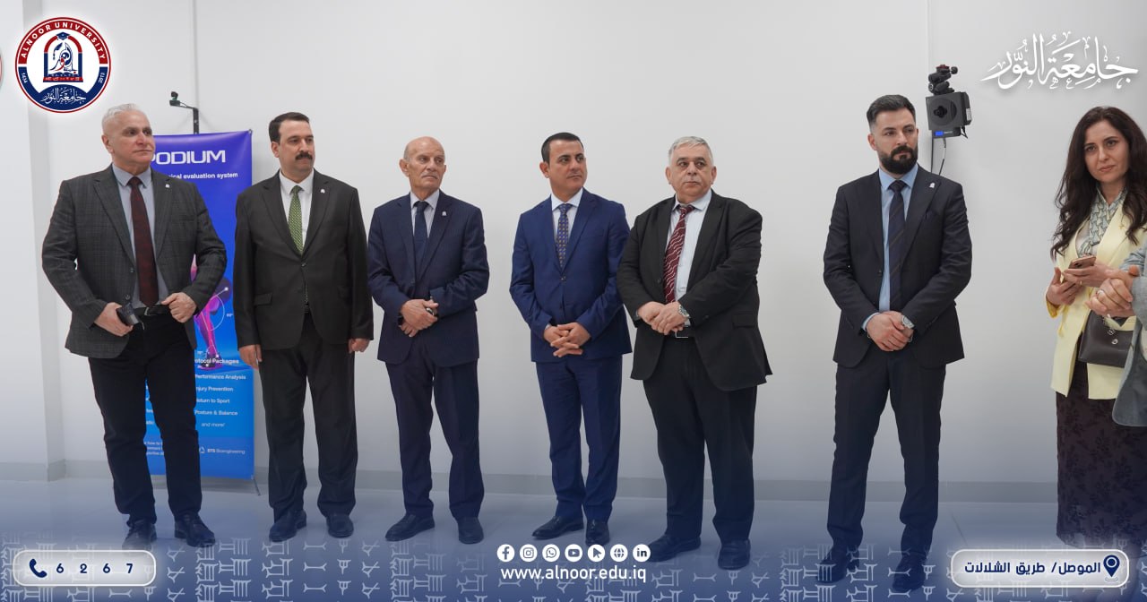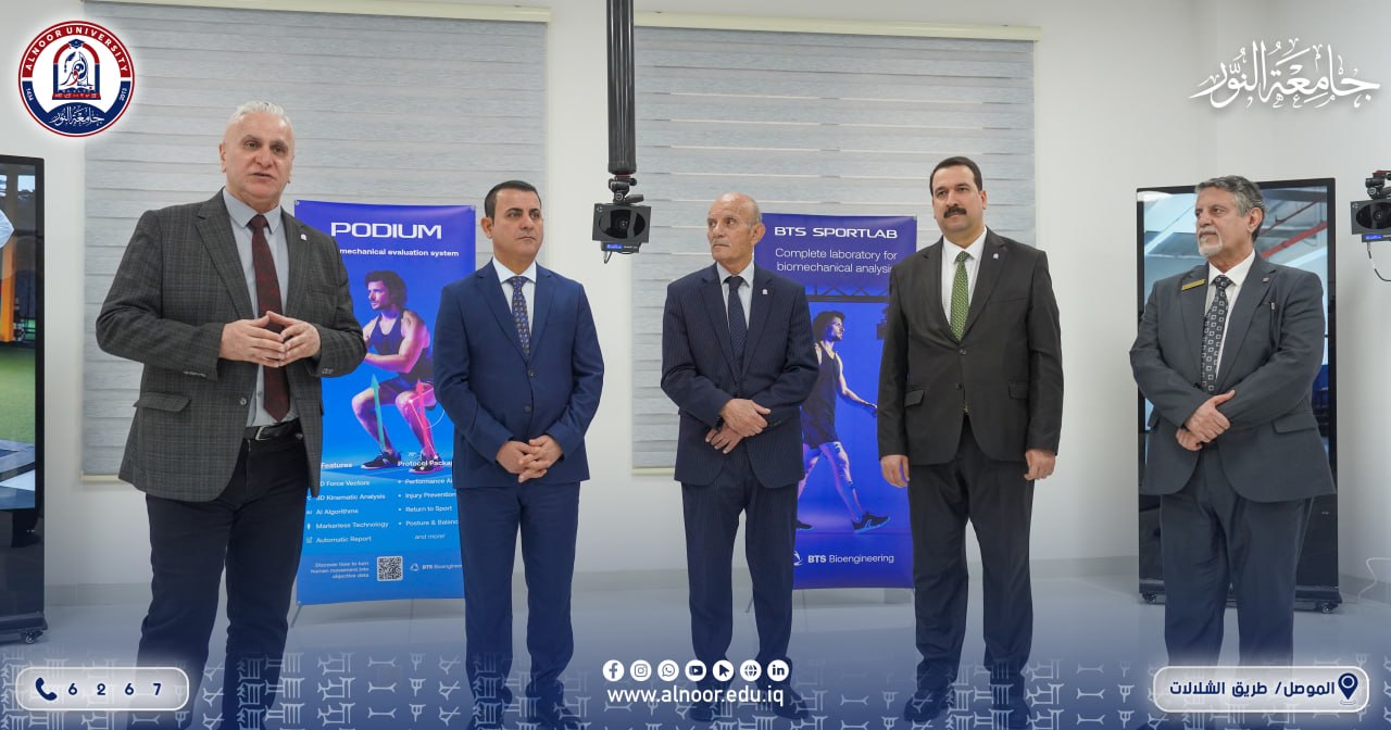 بحضور الاستاذ الدكتور ياسين طه الحجار رئبيس جامعة النور والاستاذ الدكتور نشأت مبارك رئيس جامعة الحمدانية افتتحت جامعة النور ممثلةً بـقسم التربية البدنية وعلوم الرياضة ظهر يوم الاربعاء الموافق 2026/4/8 مختبر الفسلجة والبايوميكانيك الحديث في خطوة علمية نوعية تهدف إلى تعزيز جودة التعليم والبحث العلمي ومواكبة التطورات العالمية في مجال علوم الرياضة والأداء الحركي. ويعد هذا المختبر من المختبرات المتقدمة التي تجمع بين القياس الفسيولوجي والتحليل البايوميكانيكي حيث تم تزويده بأحدث الأنظمة والتقنيات الرقمية الخاصة بتحليل الحركة البشرية بدقة عالية من بينها نظام PODIUM للتحليل البايوميكانيكي ثلاثي الأبعاد ومنظومة BTS SPORTLAB المتكاملة واللتان توفران بيئة علمية متطورة لدراسة الأداء الرياضي. كما ويمثل المختبر دعما حقيقيا لتطوير قدرات الطلبة والباحثين من خلال ربط الجانب النظري بالتطبيق العملي ورفع كفاءة التدريب الرياضي. كما يسهم في خدمة المجتمع الرياضي عبر تقديم الاستشارات العلمية وتحسين الأداء والوقاية من الإصابات الرياضية.