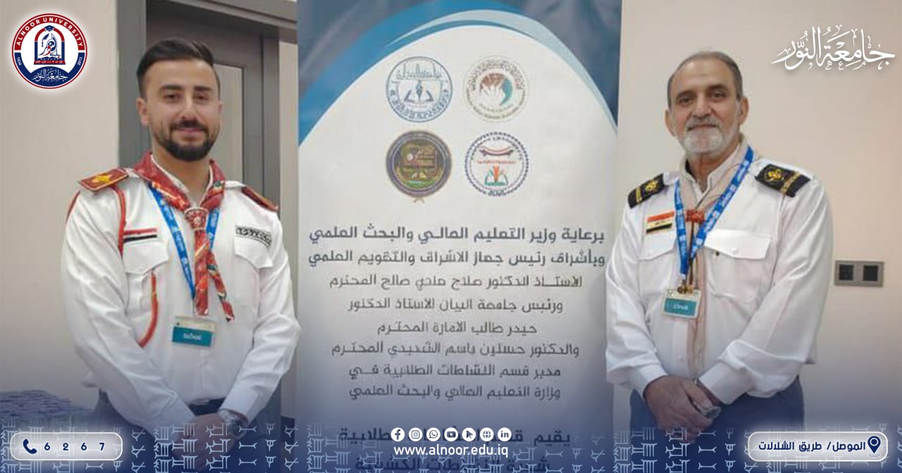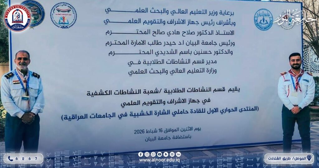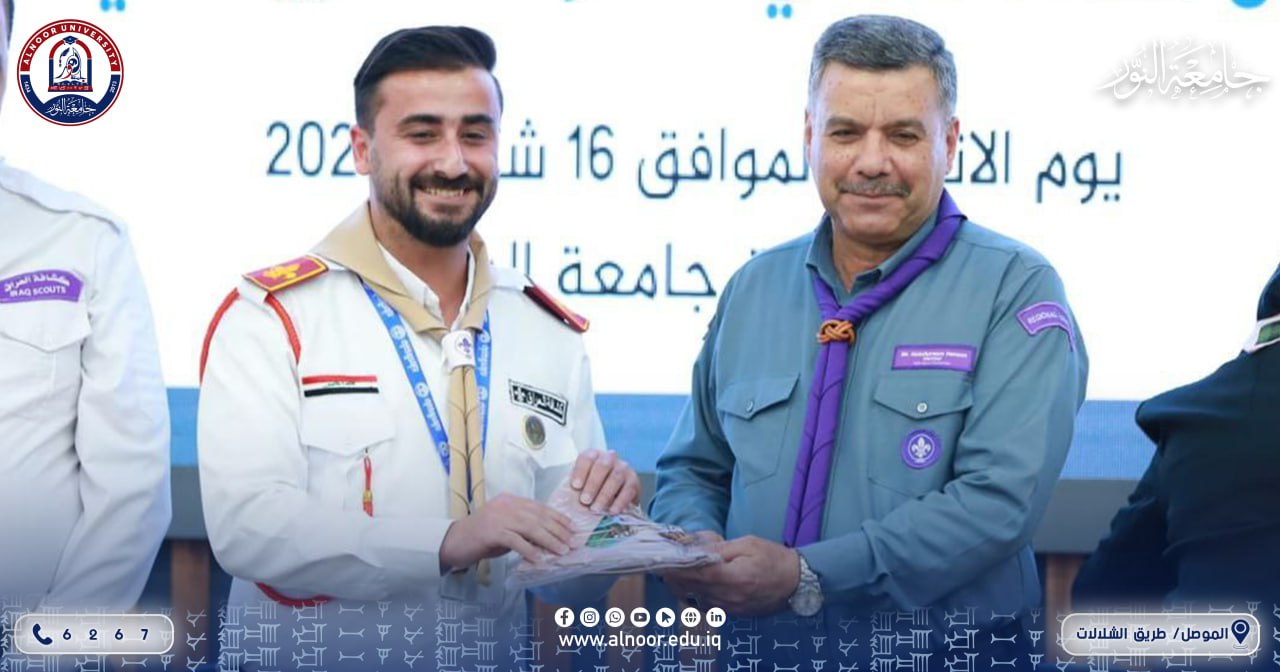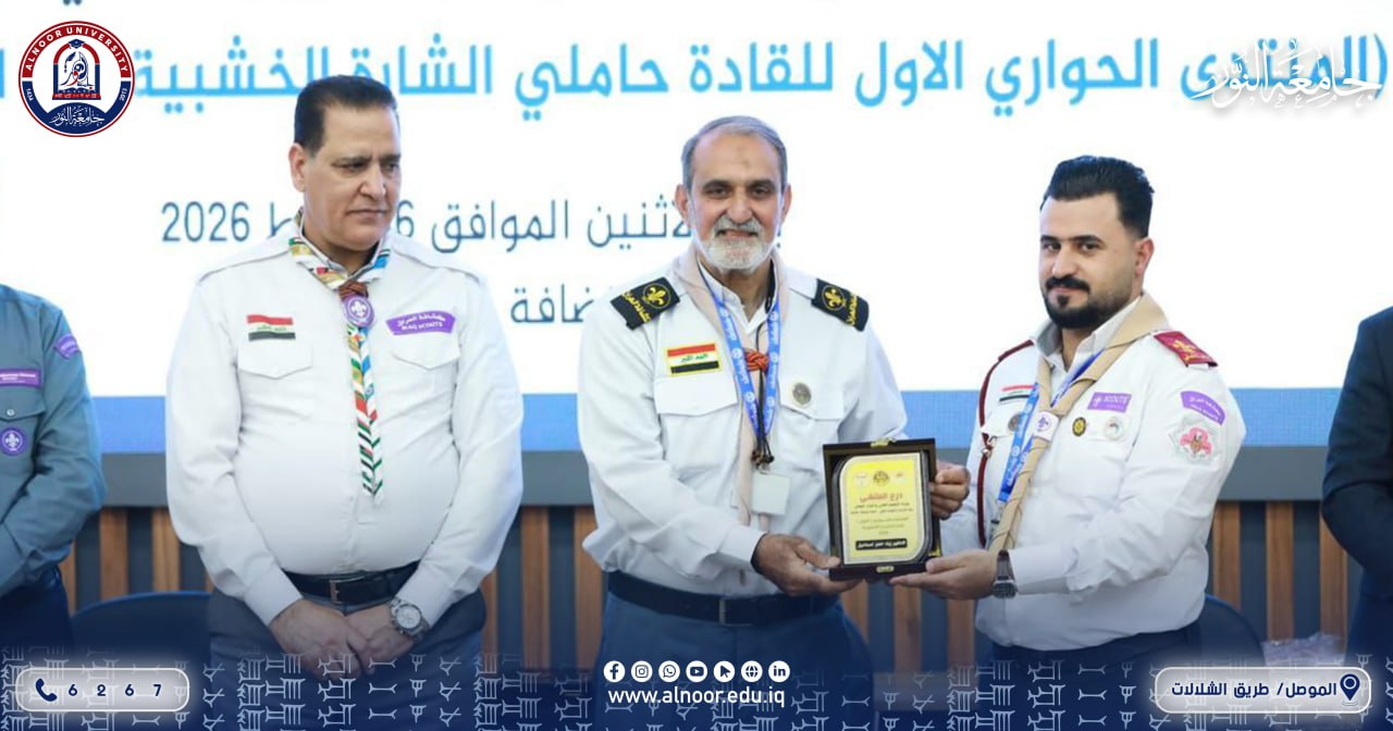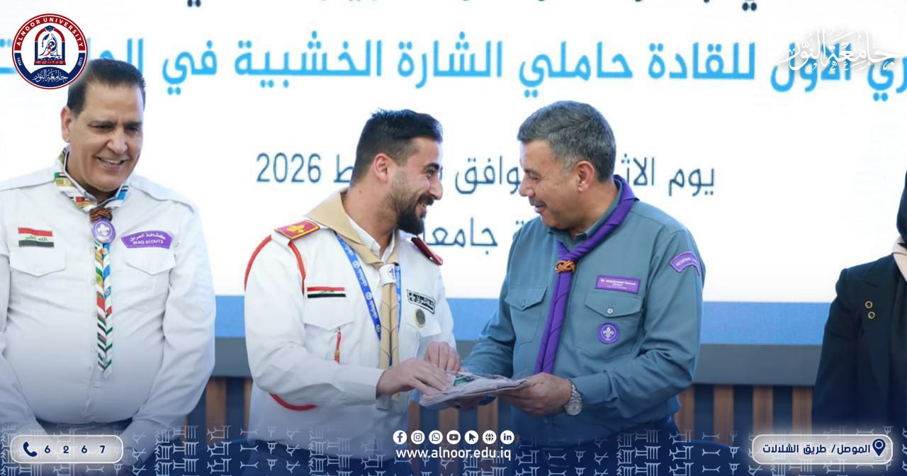 ضمن مشاركة جامعة النور في “المنتدى الحواري الأول للقادة حاملي الشارة الخشبية” المقام في جامعة البيان، حظي ممثلو جامعة النور بتكريم رفيع المستوى تقديراً لجهودهم في تعزيز الحركة الكشفية، حيث سلّم القائد عبد الكريم حنون المفوض الدولي للكشافة العراقية وعضو اللجنة الكشفية العربية درع تقديري للمدرس الدكتور زياد خضر اسماعيل، كما وشّح المدرس المساعد مصطفى محمد جميل بمنديل الشارة الخشبية مع شهادة تقديرية. بما يعكس التزام جامعة النور بدعم الكفاءات القيادية في المحافل الوطنية والعربية.